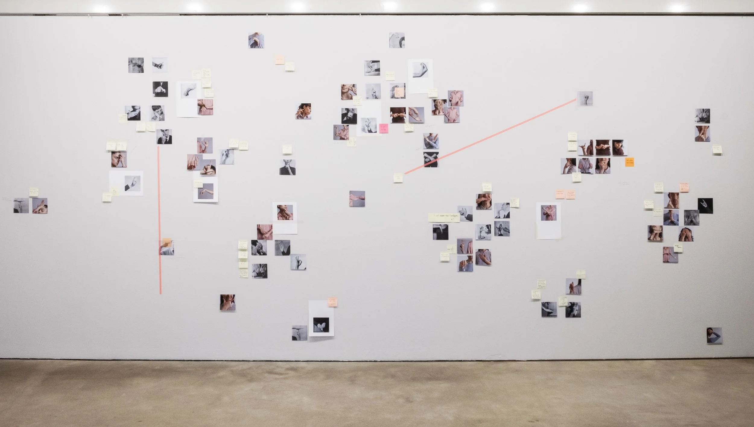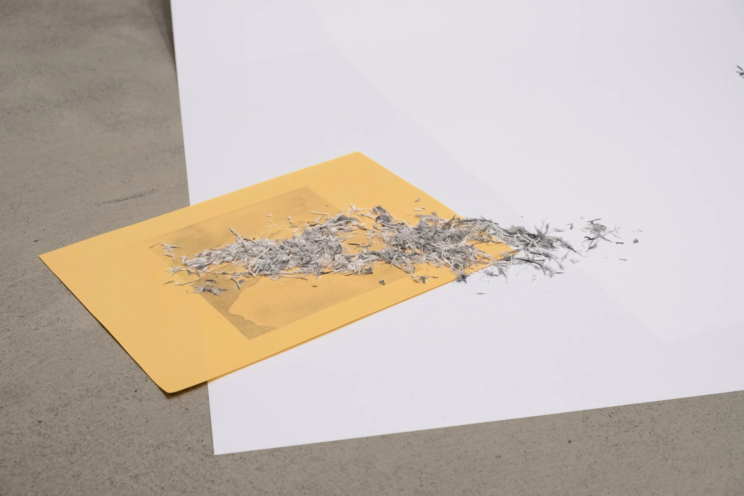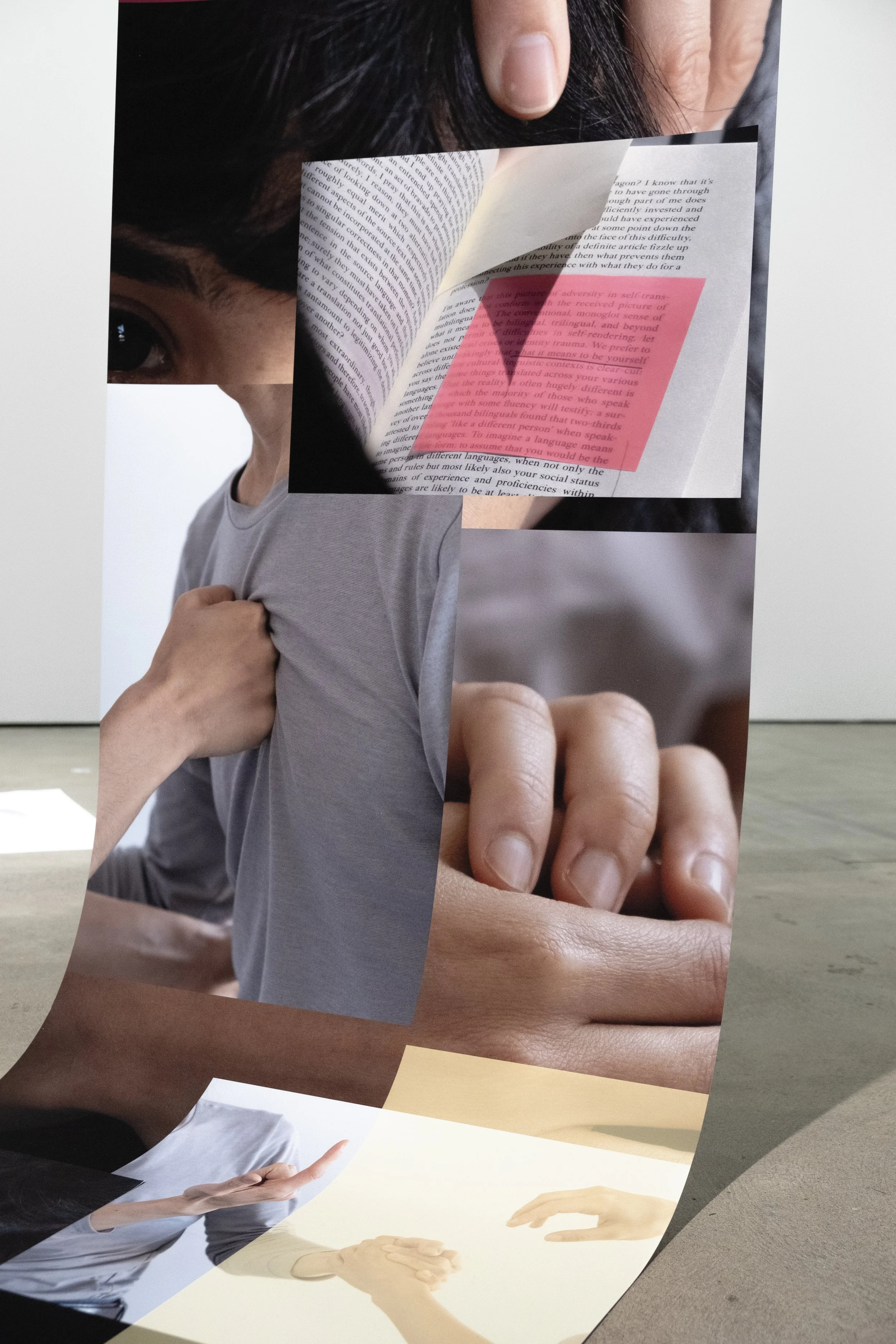 Hanging on their every tiny movement, 2024 . Photographic paper, colored paper, paper clips, and book “Fifty sounds” by Polly Barton