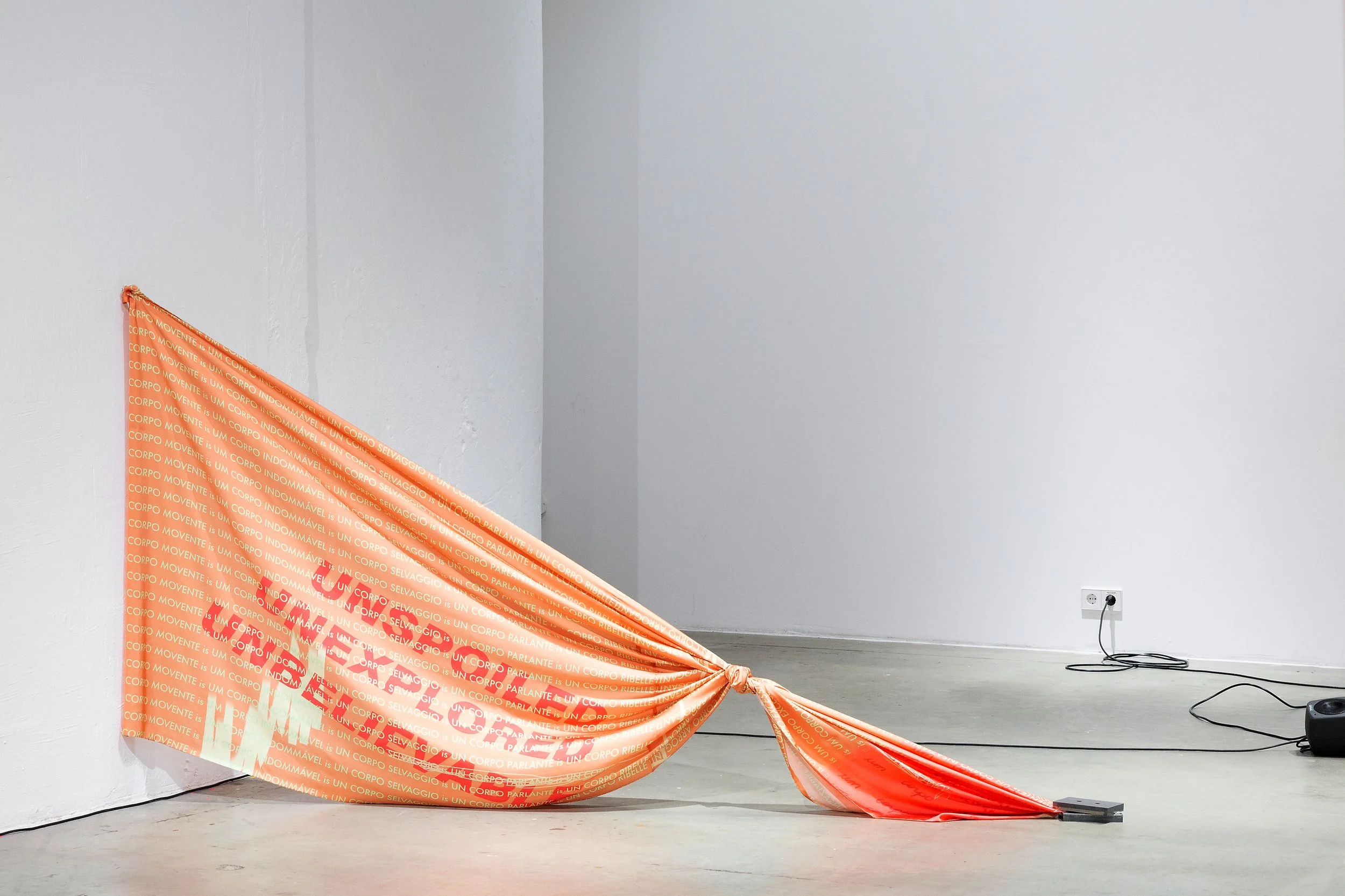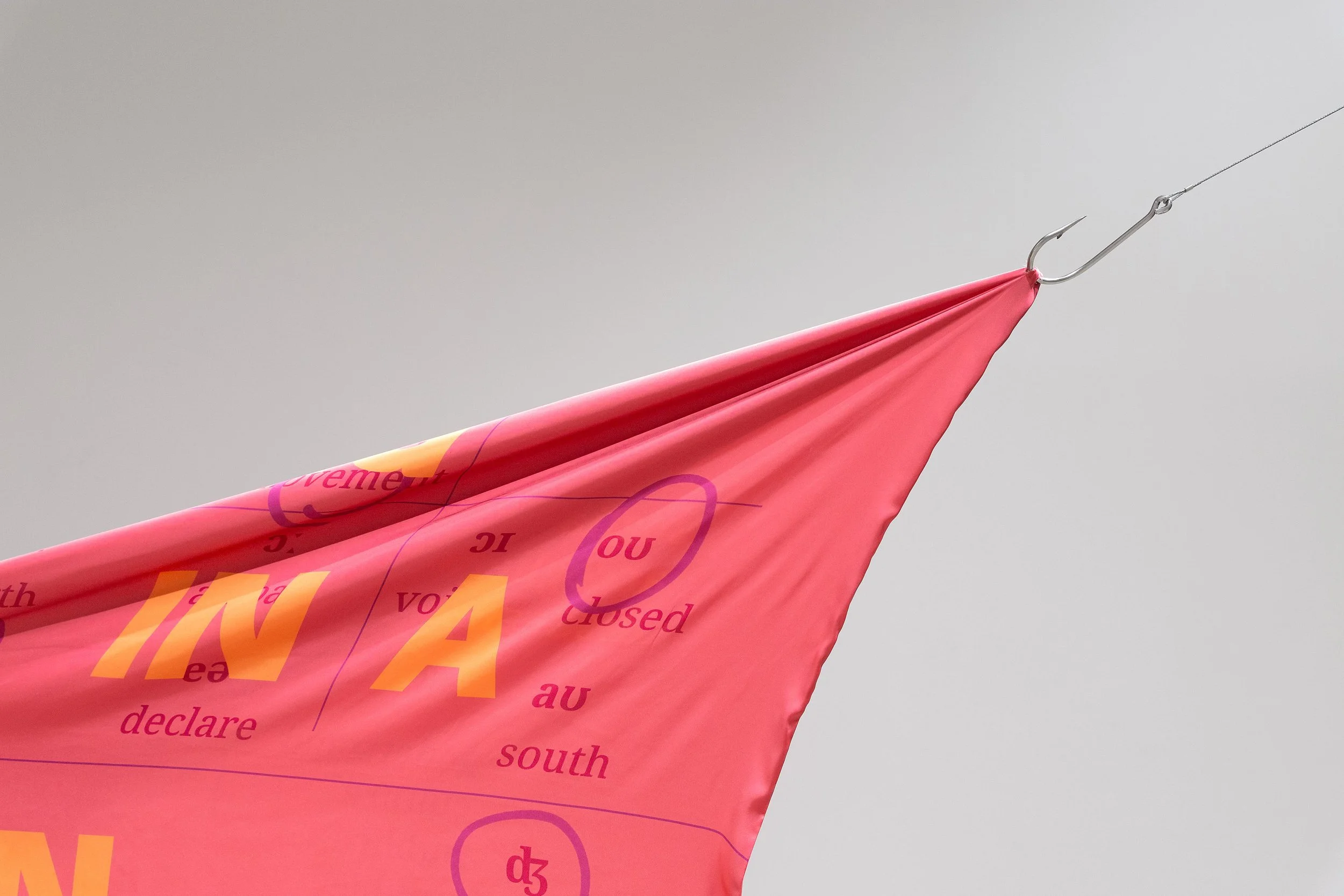 Where Grammar Rots, Where Letters Slip (2022). Digital print on silk, metal plates. Ph. Hedi Jaansoo